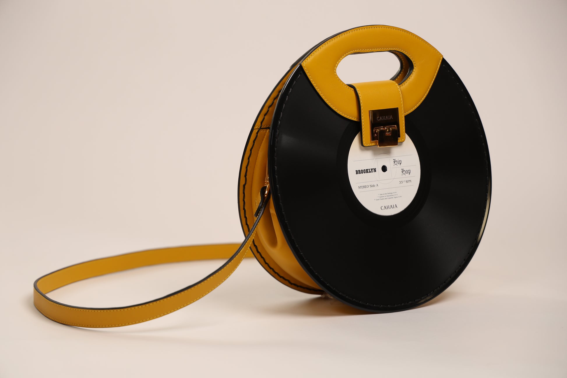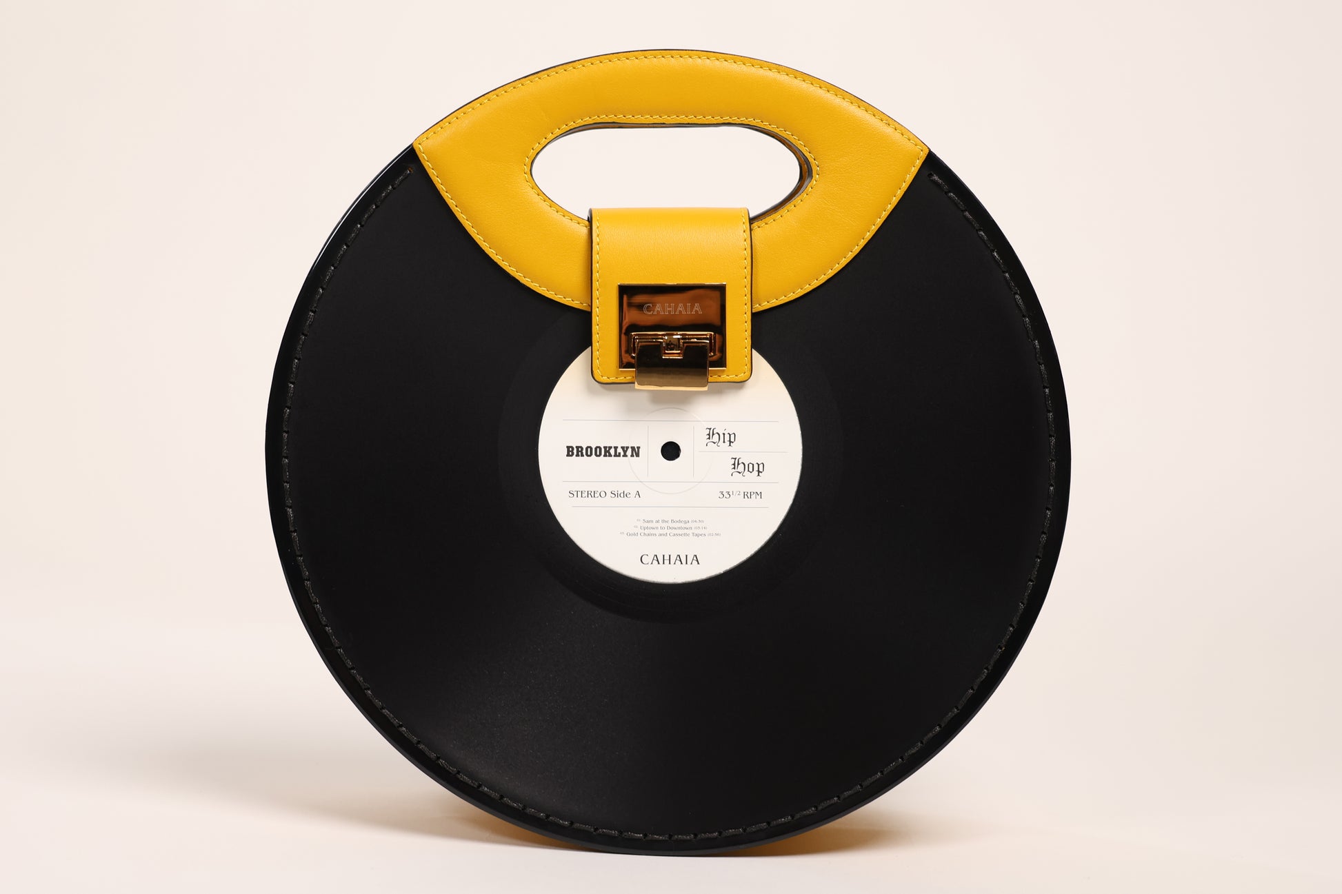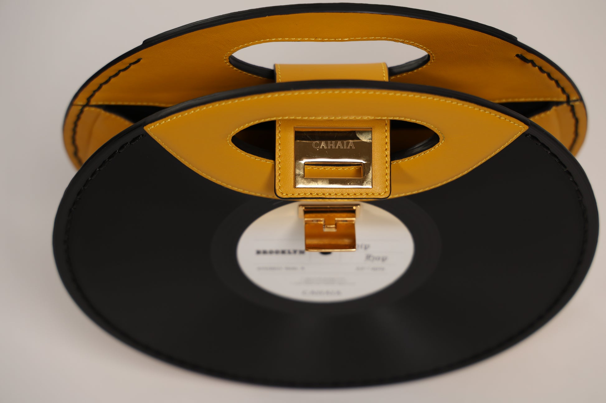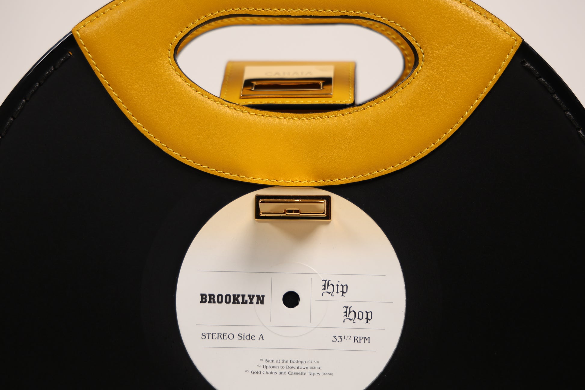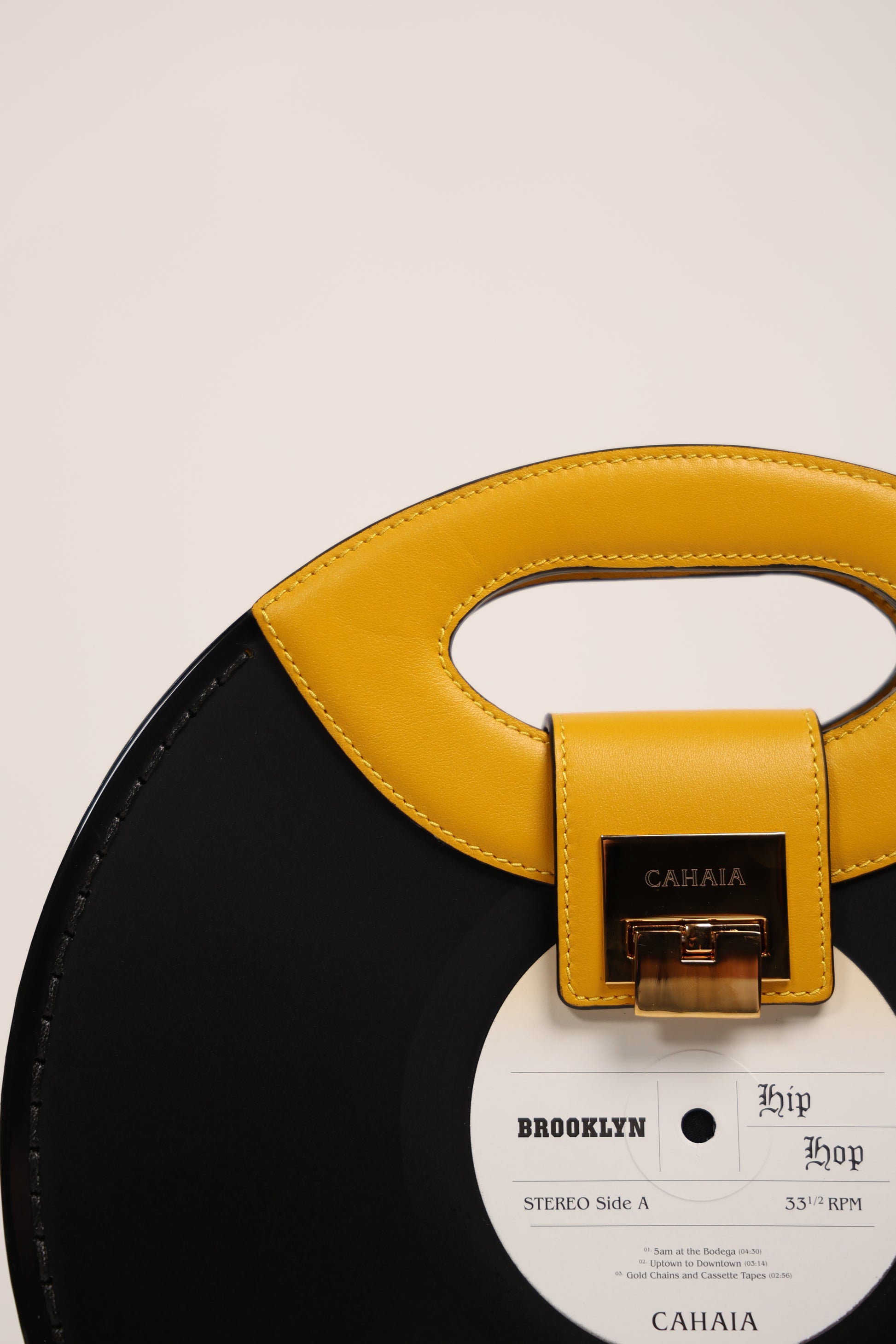 Made from upcycled vinyl records and yellow leather, the bag's yellow color captures the energy of Brooklyn streets: the flash of taxis, the colorful graffiti, and the glow of streetlights in every corner. The label fades with a yellow tint, like a Brooklyn sunset over rooftops, where hip hop found its voice and still echoes today.