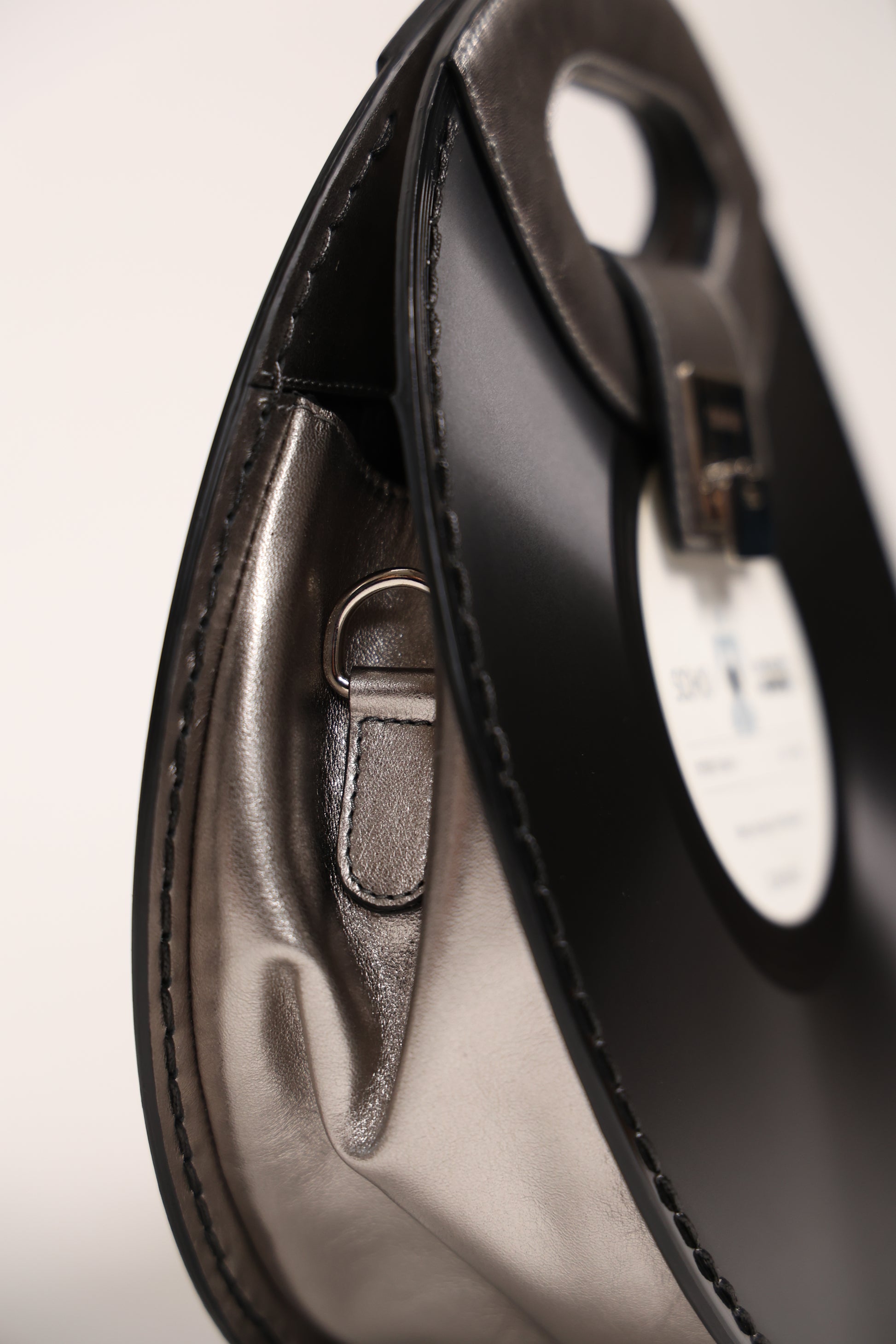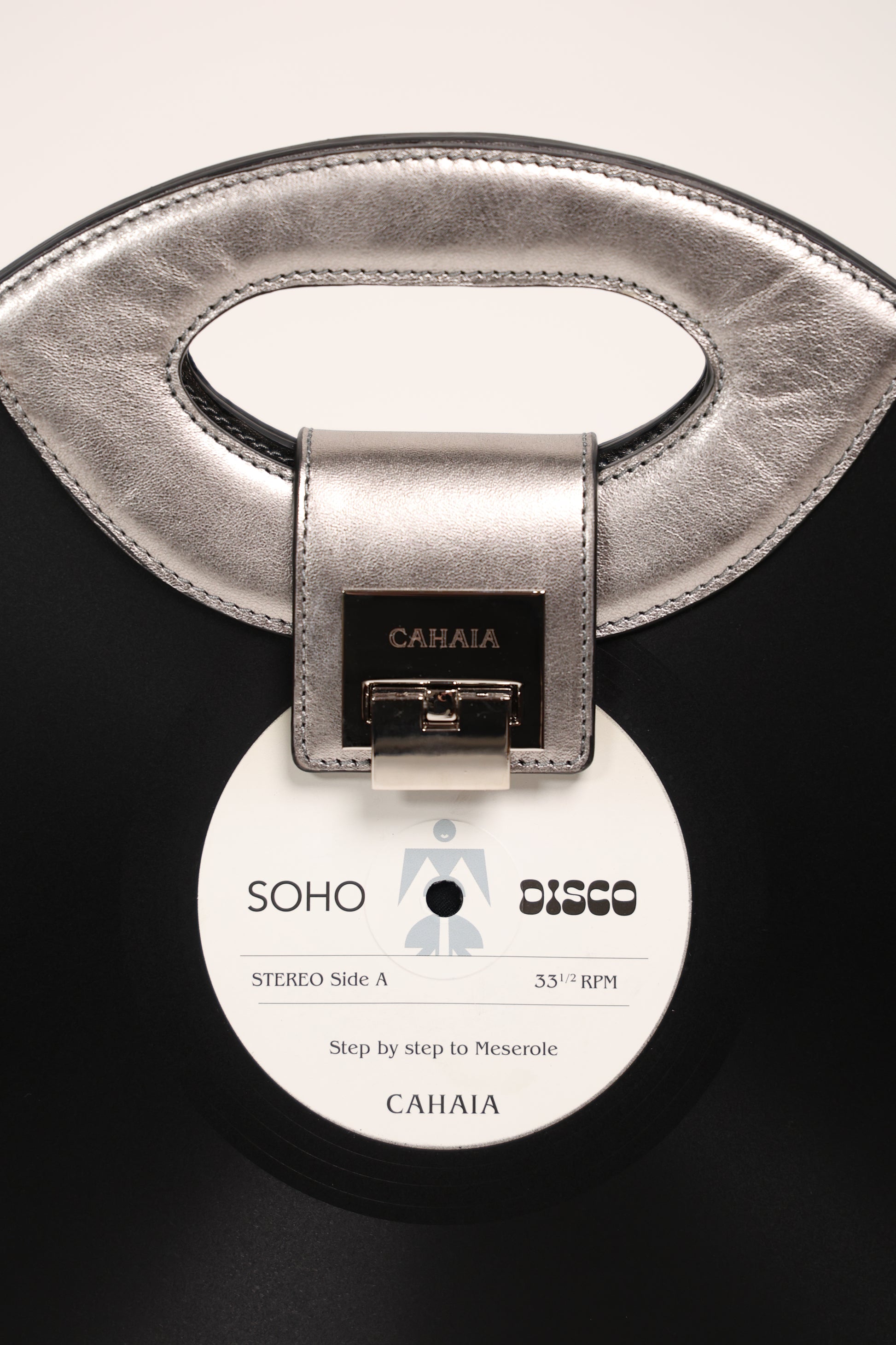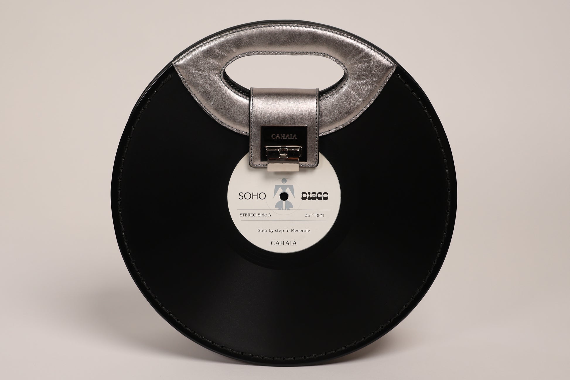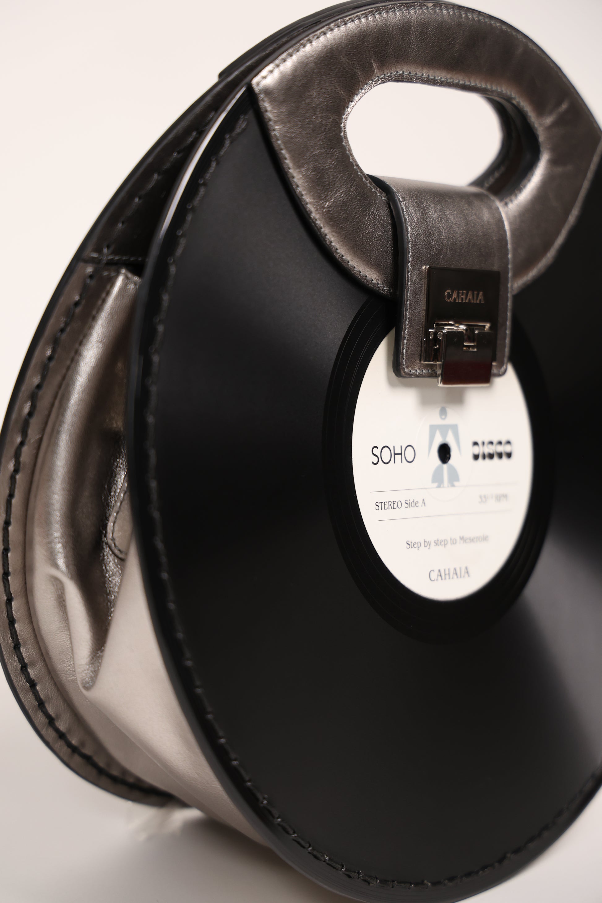 Made from upcycled vinyl records and silver leather, this bag’s silver hue evokes the shimmering energy of the dance floor. Inspired by the iconic disco ball, the material echoes the shifting light and rhythm that once filled Soho’s nightclubs. On the vinyl label, a stylized figure stands at the center, a nod to the individuality, flair, and playful spirit that defined disco’s golden age. Each piece carries the bold soul of Soho’s nightlife, a rhythm that still moves everyday through New York city today.